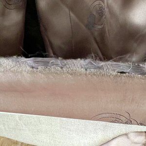 The lining shows wear along the hemline and stretched portions in some areas, close to seams and the cuffs. The lining of the pocket has pilling as expected on a vintage piece. The cuffs show some wear along the lower edge, more on the left cuff, due to touching a wrist watch, but since it is fluffy it is not readily visible.