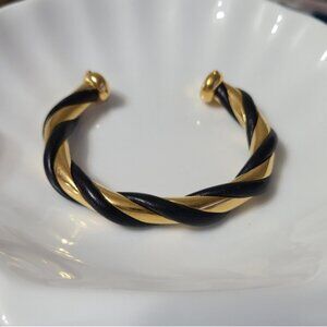 Stunning Hard to Find Vintage Hermes Torsade Gold Black Leather Twist Bangle Open Cuff Bracelet