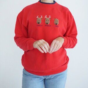 This Vintage M&C Sportswear Red Embroidered Reindeer Dancer Prancer Vixen Crewneck Festive Sweater is the perfect piece to bring some holiday cheer to your wardrobe. The bold red background is adorned with playful embroidery of the beloved reindeer—Dancer, Prancer, and Vixen—each depicted in vibrant detail. The sweater’s festive design is completed with intricate stitching that captures the spirit of the season in a charming and whimsical way.