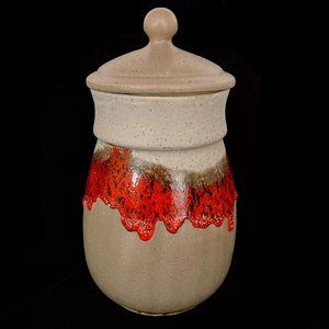 This wonderful ensemble has a nice thick orange lava drip surrounding the container...it is nice and large.Would look amazing in any MCM kitchen decor, perfect to put flour, sugar, spices or cookies! Possibilities are infinit.
