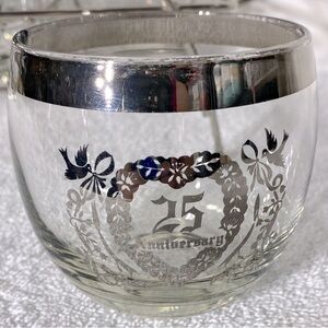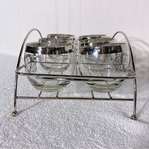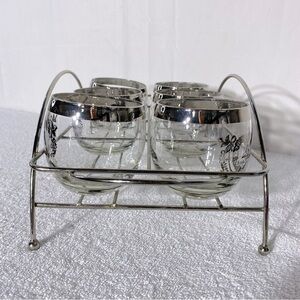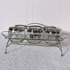 Vintage MCM 25th Anniversary Roly Poly Glasses W Silver Rim & Chrome Caddy