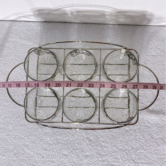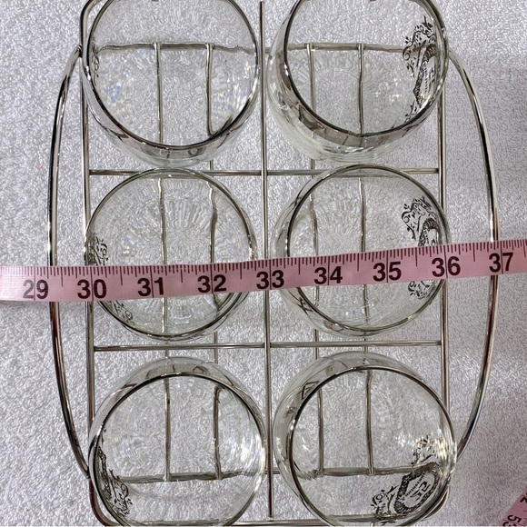 Elegant set of six silver and clear glasses with a matching holder. Perfect for entertaining.