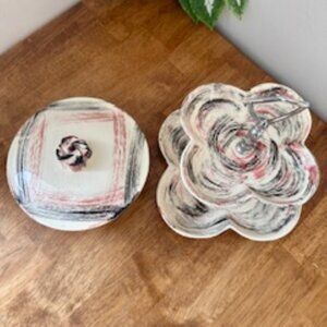 Embrace mid-century charm with this vintage MCM California pottery set, featuring a striking 2-tiered stand and a matching covered serving dish. Perfect for entertaining or adding a retro touch to your decor.