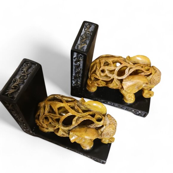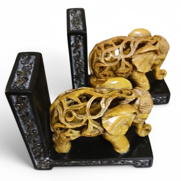 These rare, vintage bookends feature intricately carved elephants resembling ivory, made from durable resin. The base is carved to mimic antiqued wood, offering a timeless, elegant look. Measuring approximately 7" x 7" x 2.75", they make a statement as both decor and functional book holders. Ideal for collectors or those who appreciate vintage Asian-inspired decor, these bookends are a beautiful addition to any space. In excellent vintage condition, circa 1950-1970. Don’t miss this unique collectible!