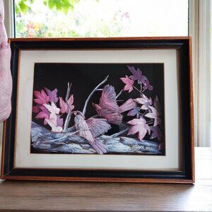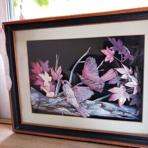 This beautifully rare handcrafted vintage 3D Art shadow box features real feather art depicting two birds perched on sculpted branches with delicate pink leaves. Set against a striking black background, the pastel pinks and purple-blues of the feathers create a soft, ethereal feel. The piece is professionally framed and sealed on the back, with no visible artist signature. Some light watermarks on the inner mat, minor dust inside the glass, and gentle wear on the wooden frame add to its vintage charm. Measuring approx. 14" x 11" x 2.5", this artwork has excellent restoration potential or can be displayed as-is for a true vintage look. A unique piece of nature-inspired wall decor perfect for collectors or lovers of handmade art. A timeless collectible perfect for vintage art and bird lovers alike.