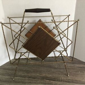 Elegant vintage magazine rack featuring a twisted gold metal frame with brown faux wood accents. Perfect for adding a touch of retro charm to your home decor. Dates to the 50s or so. Can hold records, magazine, towels or anything you can think of!