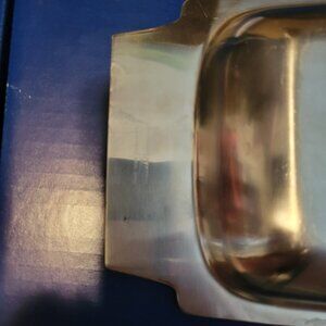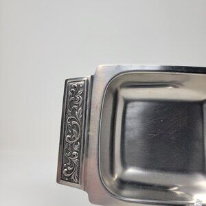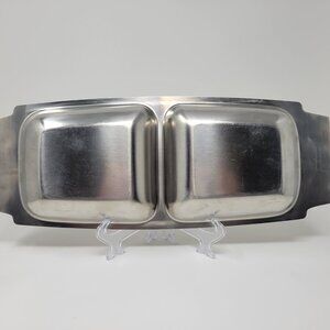 A lovely piece of mid-century stainless steel serveware. Measures 15 1/2 inches long and 6 inches wide, at the widest point. Does show some signs of age - scratch marks from utensils. Can not read the brand name on the reverse of the handle. Could be used as serveware or would make a really nice food/water bowl for a cat or small dog.