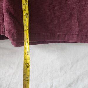 Well-loved Mountain Equipment Co-op shirt from their MEC Organics collection. Soft, broken-in feel with a deep burgundy color and front chest pocket. Tag has been removed — size is estimated as Medium. Classic outdoorsy style and ethically made.