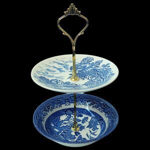 These Mini Blue Plate Stands are made from mismatched Transferware plates, with gold-toned hardware. Perfect for afternoon tea parties when you want something pretty to serve a little something special on. These versatile stands are also perfect for just sitting on your kitchen counter, for trinkets or even in your bathroom as a display item for guest soaps, and they make great gifts!