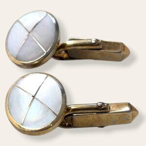 These vintage cufflinks are made of a gold tone metal and have tilted toggle backs. The tops of the cufflinks are shaped like wide ovals and each filled with a piece of mother of pearl. There is a gold X going across each as an accent. There is wear throughout though it's most visible on the backs and the toggles, not on the fronts. Still, the cufflinks are wearable.