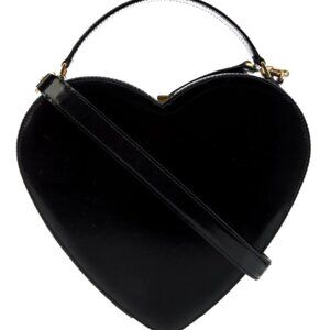 Iconic heart-shaped handbag by Moschino, crafted in glossy black patent leather with gold-tone hardware and a single top handle.