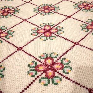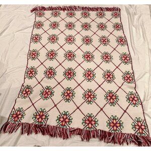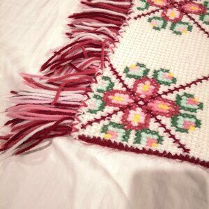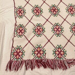 This vintage machine knit wool blanket features a charming cross stitch floral pattern and tassels for a cozy cottage style. The cream, red, and pink colours add a warm touch to any living room, bedroom, or family room. Measuring 84\" by 46\", this rectangular blanket is made of high-quality wool and features a knitted texture for added comfort. Perfect for snuggling up on a chilly evening or as a decorative accent piece, this blanket is sure to become a beloved addition to your home decor. The blanket has a thick heavy wool feel to it.