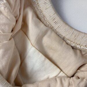 The perfect beach/summer bag! Cream colour macrame/crochet/knit bag with gorgeous round wood handles. Fully lined with interior pocket. Some natural minor wear from age as pictured.