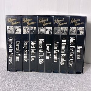Classic Hollywood romance films in a 10 pack video set. Features iconic black and white cover art.