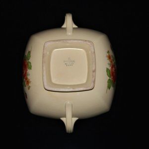 Madame Gautier is a beautiful pattern featuring blossomed roses, rose buds, other flowers, and leaves. Made by Homer Laughlin China Company at their Newell plant, the backstamp dates this piece to 1933. At ninety years young, it's in excellent condition. The bowl interior appears pristine, without utensil scratches. There is no crazing, chips, or cracks. The footed bowl with handles and lid stands 5" tall and is 9.5" from handle-to-handle.
