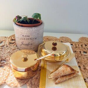Elegant Vintage Italian Gold Plated Brass Condiment Set - Covered Jam Pot Covered Butter Dish