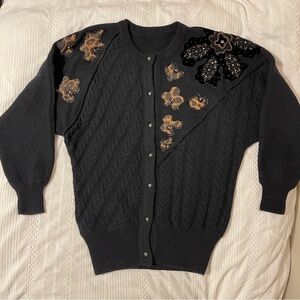 Vintage Made in Italy Wool Cardigan with Animal Print Accents Black