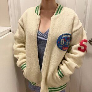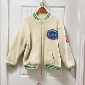 Vintage Made in Japan 80s Wool Knit Hockey Varsity Jacket Cream