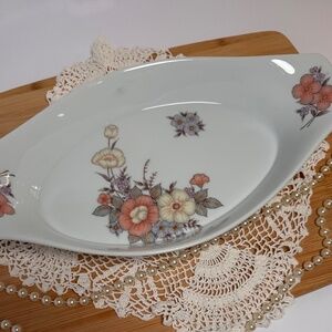 This beautiful oval serving platter features delicate pastel florals in peach, cream, and soft blue on a milky white background. A total grandma-core / cottagecore dream.