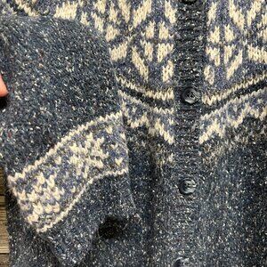Lovely vintage Maggie cardigan. Norwegian pattern. Marbled blue plastic buttons. Knit is chunky.