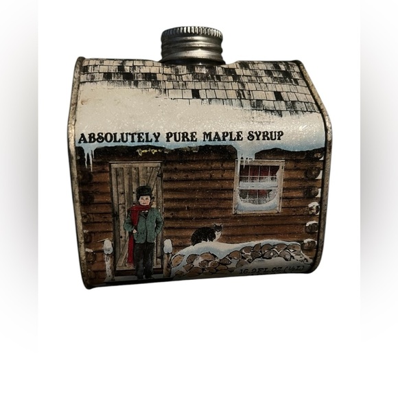 Charming vintage tin featuring a cabin scene. Perfect for collectors.