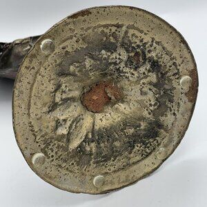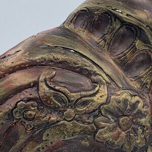 This is a unique 14-inch tall vintage decorative mask sculpture, crafted from cast metal with intricate detailing and a beautiful patina finish. The sculpture features an ornate floral motif on the 7-inch wide base, complementing the elegant design of the 9-inch wide mask. The piece showcases timeless artistry and makes a perfect collectible or statement decor item.