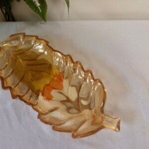 Vintage Marigold Carnival Glass Leaf Dish Iridescent Fall Decor Retro Glass Tray