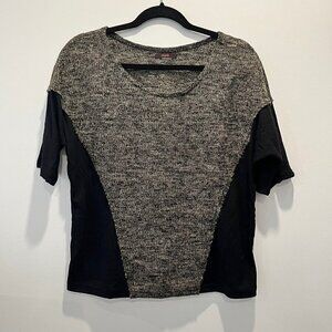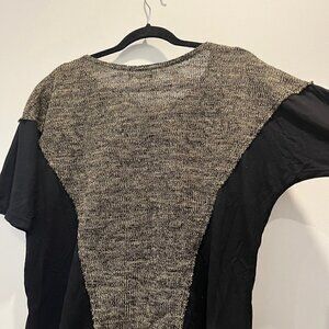 Beautiful black and gold rib knit dolman sleeve blouse/top in excellent preowned condition. No major flaws but the size tag has been removed. Due to the size and fit, estimating a women's Small, but could easily fit a Medium as well depending on how loose and flowy or fitted you prefer it. The fit is boxy and flowy but the panels give a really flattering slimming shape. Love the subtle glittery/shimmery gold sparkle in the knit, it's hard to pick up on camera how pretty and subtle it is, video shows the sparkle much better. The black portion of the top is a soft stretchy jersey knit