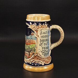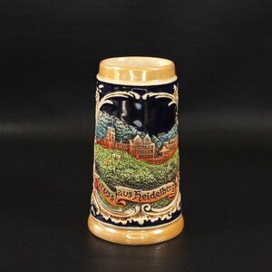 This is a vintage miniature beer stein by Marzi and Remy in Germany. It features a full color, raised relief scene of a castle with a banner declaring, "Gruss aus Heidelberg." This is flanked by two panels. To the left, "Du Stadt an Ehren Reich." To the right, "Alt Heidelberg Du Feine."
