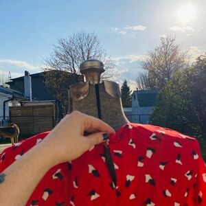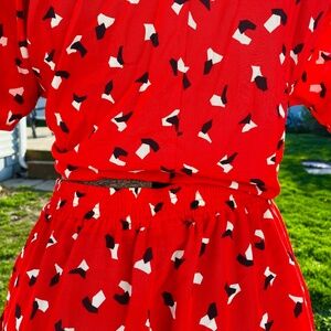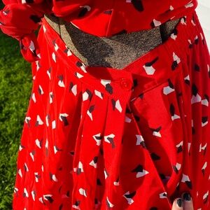 Red patterned skirt and shirt set, size 6, has pockets, excellent condition.