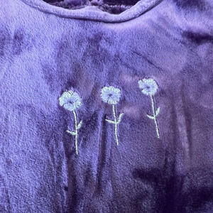 In excellent, cleaned condition. Beautiful purple colour (like Grimace)! Embroidered purple flowers on the front, with bows at the bottom. Velour look and feel. Flowy.