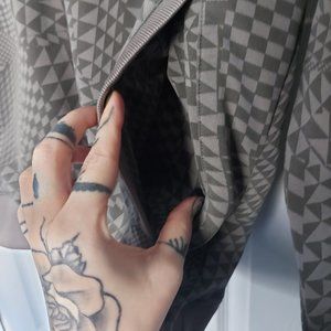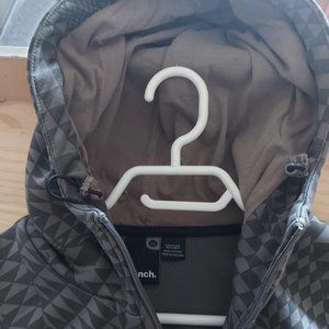 Sweater is a two-toned gray geometric pattern with light gray ribbed cuffs and a light cream lined hood for contrast
