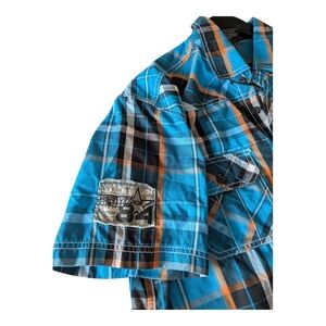 Stylish and comfortable, this vintage, blue plaid shirt is perfect for casual outings. Features a classic design with short sleeves for a relaxed fit. Pictures are part of the description. Please review the photos.