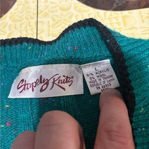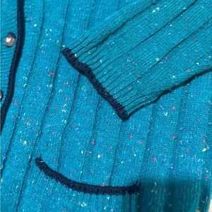 Elegant teal cardigan with black trim. Features button-up front and two pockets. Ideal for layering.