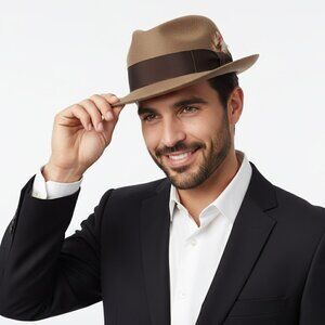 Vintage Men's Commardore Wool Felt Fedora Trilby Hat Retro Feather Brown Tan