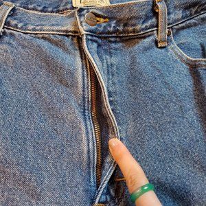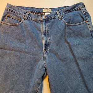Relaxed fit L.L. Bean vintage medium wash jeans with plaid cotton lining in yellow/cream, dark red and dark green. 100% cotton.