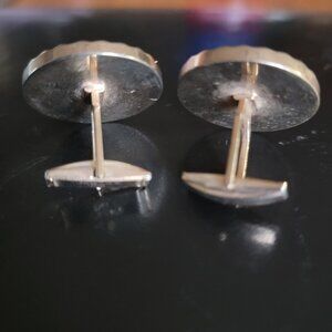 A classic addition to any mans wardrobe-featuring a round onyx Jem stone inserted into a silver etched base- In good vintage condition-smoke free home-shipped via Purolator until postal issues settled-interested in more than one item create a bundle to save on shipping
