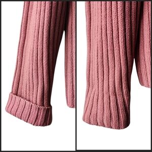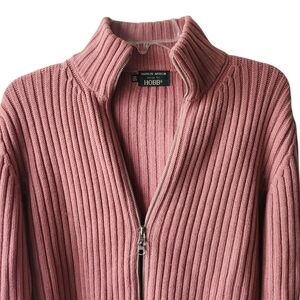 Vintage Merino Wool Cardigan Women L Dusty Rose Full Zip Mock Neck Ribbed Knit