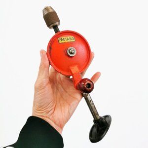 This is a manual hand-held pinion breast drill made by Metabo. It has a metal body and mechanism with wood handles and is marked E 5124 (over) 2 on the crank. The first hand-held drill was developed in Germany by Albrect Schnizler in 1923 and Metabo, founded in 1924, got its name from this hand drill, the "Metallbohrdreher." Rich history for a manufacturer that now offers a wide range of quality power tools.