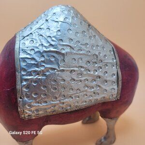 Vintage Metal Camel Silver Tone with Red Leather Desert Camel Pair Decorative. This pair of small silver-tone camel figurines is the perfect addition to any room. The metallic finish and intricate detailing make them a unique and eye-catching decor piece. Handmade with red leather accents, these camels bring a touch of elegance and charm to your space. Ideal for collectors or anyone who appreciates animals and desert-inspired decor. Perfect for all occasions, these figurines are sure to be a conversation starter in your home.