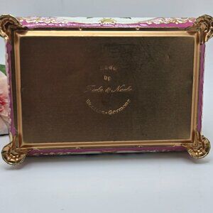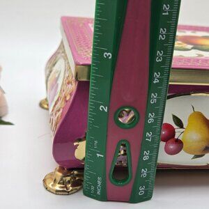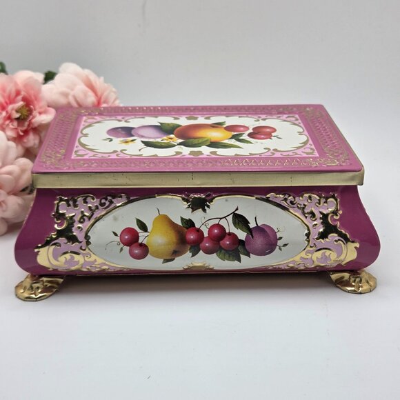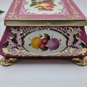 This charming vintage Fricke & Nacke tin fruit vanity trinket box is a delightful addition to any collection. From Germany, this piece features an elegant pink hue and intricate footed design, showcasing the fine artisanship of its era.