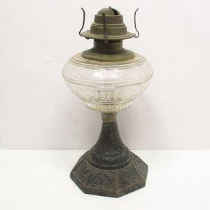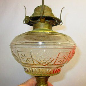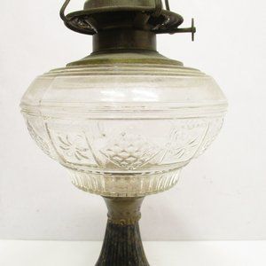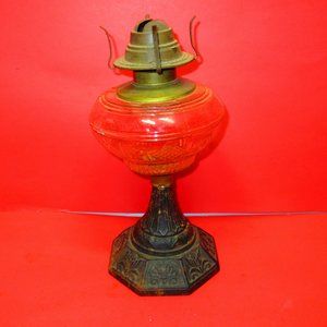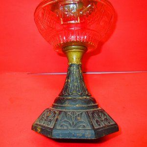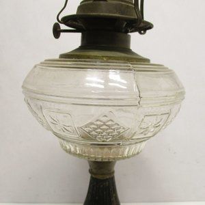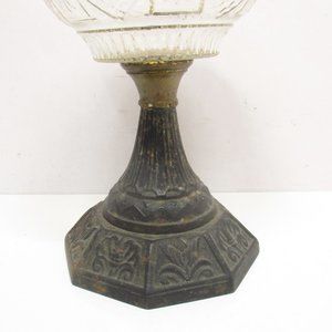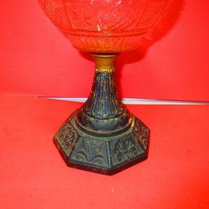 Up for sale is a Vintage Metal Pedestal Base Oil Glass lamp. There is not glass cover for this lamp only what you see in the pictures. There are no chips or cracks. it measures abour 11 inches tall. Please take a good look at the pictures for condition.