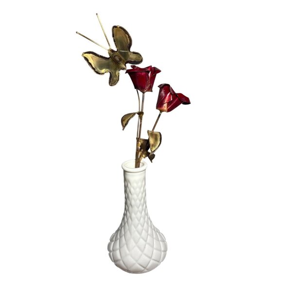 Vintage Metal Red Rose & Butterfly Sculpture In White Diamond Pattern Vase
