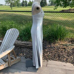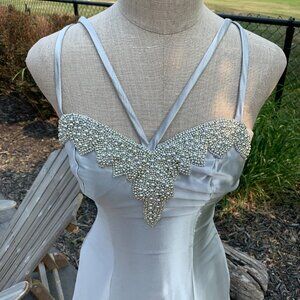 Vintage Metallic Silver Satin Beaded Maxi Dress Evening Prom Gown Union Made