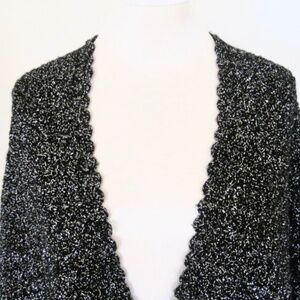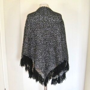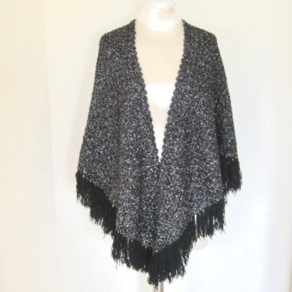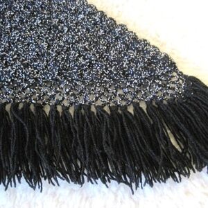 Vintage metallic triangle shawl/wrap. Color: Black/Metallic Silver. SIZE: O/S. Black wool crocheted shawl with silver lurex thread woven throughout. Finished with solid black fringe. Scalloped edge open front.