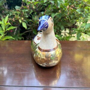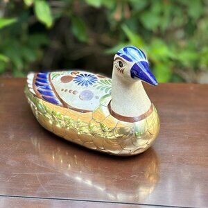Vintage Mexican Tonala Duck Hand Painted Folk Art Bird with Solid Brass Overlay