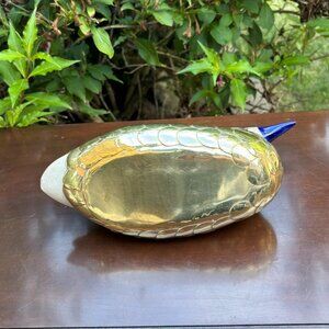 A large and vibrant vintage Mexican duck sculpture, crafted in the Tonala style during the 1970s–1990s. The body is hand-painted with stylized floral and feather motifs in cobalt blue, earthy red, and green. Its unique surface is adorned with hand-applied solid brass feather segments—gently curved, individually cut, and recently polished to a radiant shine. A beautiful example of mid-century Mexican artisan work.