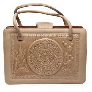 Vintage Mexican Tooled Leather Handbag Purse Pony Hair Mayan Art Double Handles Cream Tan Retro Retro1960s