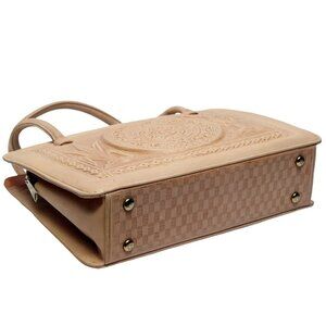 Looking for a stylish and unique handbag that's perfect for any occasion? Look no further than this vintage Mexican tooled leather purse! With its beautiful pony hair /leather construction and Mayan art design, this handbag is sure to turn heads wherever you go. The double handles provide comfortable carrying, and the cream/tan colour scheme adds a touch of retro charm.