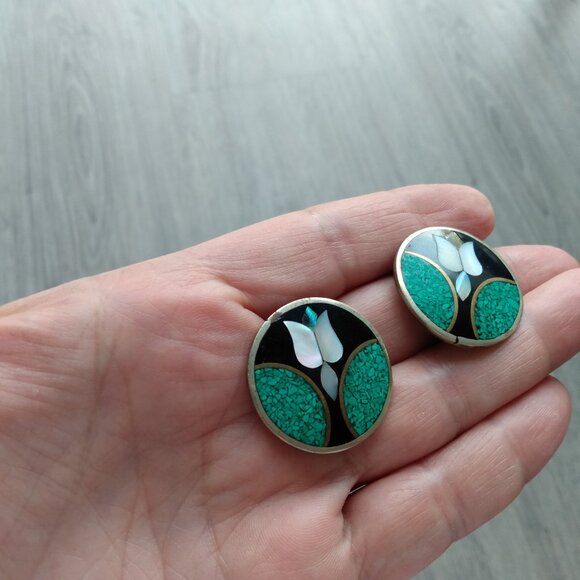 Nice pair of vintage earrings featuring an inlaid floral design of MOP and green stone chips on a black background.